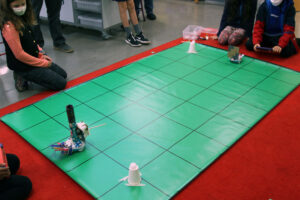 First, create a battlefield with a goal area and a home base for each team. It is helpful to mark these using masking take or wet erase marker. We suggested marking these on a robot mat that you can pull out for each class meeting, if possible. In the example below, each robot is in their marked Home Base, and the cups are taped down in their Goal areas: