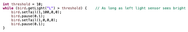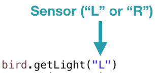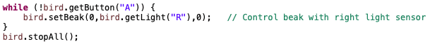 If your Finch contains a micro:bit V2, you can also use a temperature sensor in the micro:bit to measure the temperature around the Finch in degrees Celsius. The getTemperature() method returns the int value of this sensor. Room temperature is about 20°C. If you don’t have a micro:bit V2 in your Finch, you will see an error when you use this method.