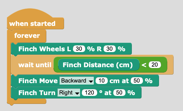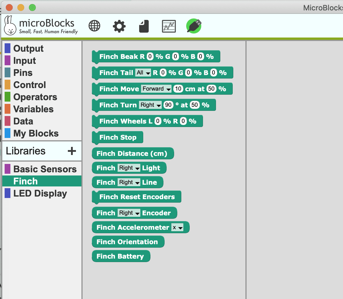 Since programs written in MicroBlocks are automatically downloaded to the micro:bit, it is an excellent choice for writing programs for the Finch. The robot can then be disconnected from the computer to roam its environment.