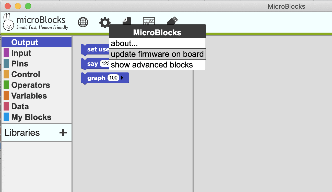 Next, open MicroBlocks. Click the Settings icon and choose update firmware on board. Choose OK when MicroBlocks asks you for permission. Your computer may pop up a window that says the micro:bit has been disconnected. Don’t worry, this is normal.