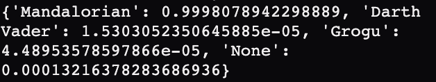 MachineLearningModel.getPrediction() returns a dictionary. Each class label is a key for the dictionary, and the value that corresponds to that key is the probability that the current image on the webcam belongs to that class. A probability close to 1 tells you that the image probably belongs to that class, while a probability close to 0 tells you that the image probably doesn’t belong to that class. For example, here the probability of “Mandalorian” is greater than 0.99, while the probabilities of all other classes are very small. Note that extremely small values are shown in scientific notation.