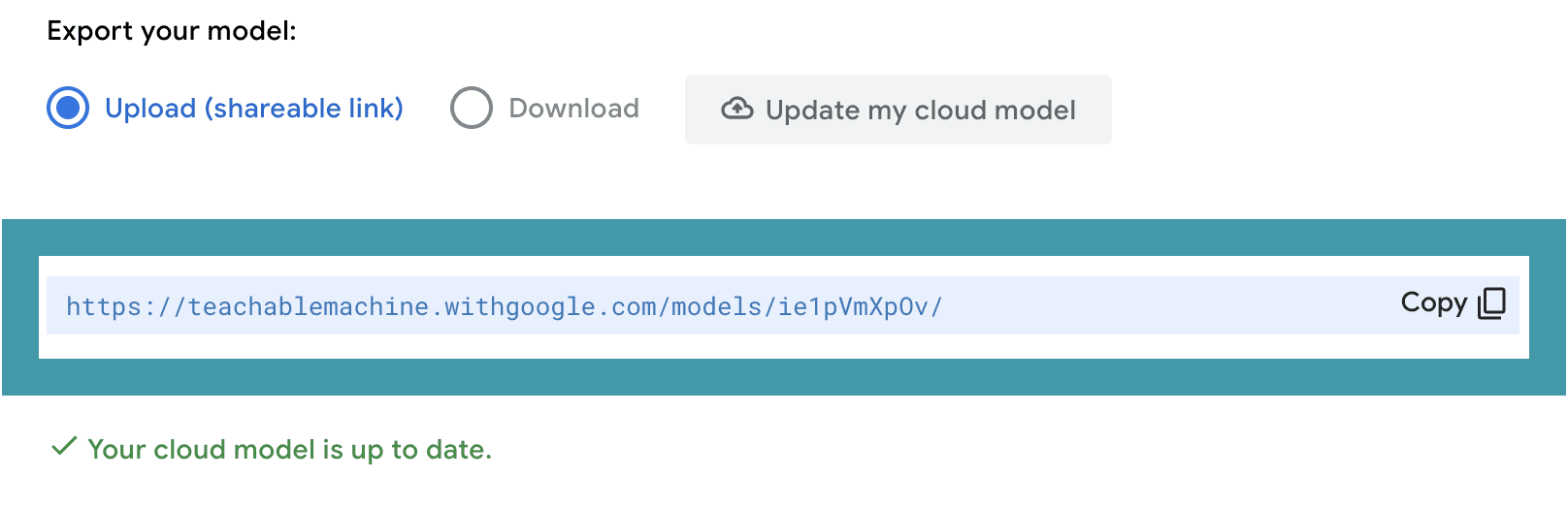 It is a good idea to save your model in case you want to reference or change it later. To do this, click on the Teachable Machine menu and either download the file or save it to your Google drive.
