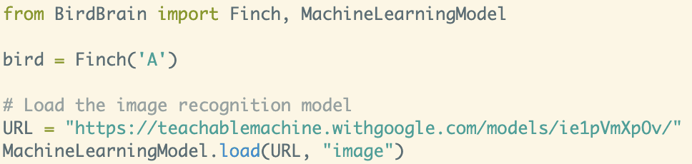 Then use MachineLearningModel.load() to import your image recognition model. This function takes two parameters. The first is a string that is the http address for your model. The second parameter is a string that denotes the type of Google Teachable Machine you are using, which should be “image” here.