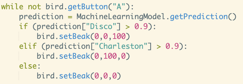 You can use the values returned by MachineLearningModel.getPrediction() to make the Finch perform certain actions when each class is detected. For example, this code changes the color of the Finch beak based on the pose that is detected. This can be a good way to check that your pose model is working properly.
