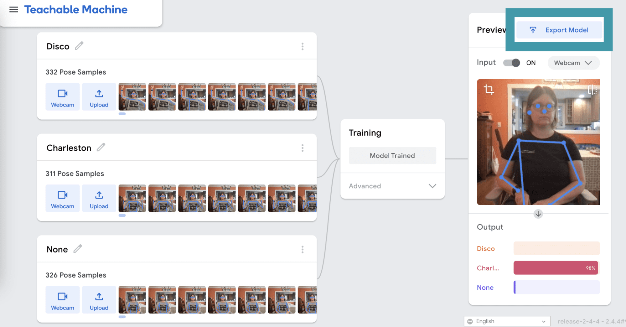 Next, train the model. You may notice that this takes longer than training the image and audio classifiers. Make sure to leave the teachable machine tab open while the model is training, even if your browser pops up a warning that the window is unresponsive.