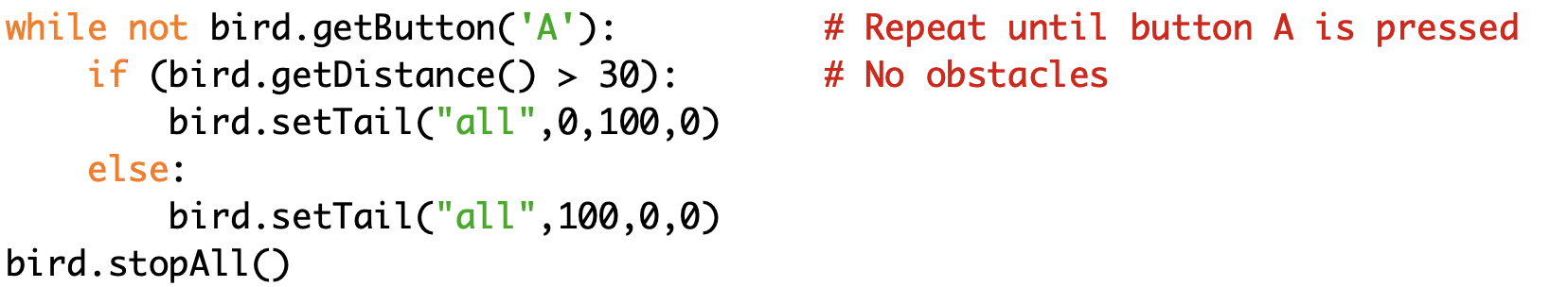 As an example, consider the code below. This code will make the Finch beak red for as long as the value of the distance sensor is less than 30 cm. The keyword while is followed by a Boolean expression, bird.getDistance() < 30. If this expression is true, the program runs the statement inside the loop and turns the beak red. Then it checks the Boolean expression again. If it is still true, the program turns the beak red again, so you will see it stay red. The loop continues repeating the statement inside it until it checks the Boolean expression and finds that it is false. Then the program skips the indented statement inside the loop and moves on to the next unindented line of code. In this case, the program turns the beak green for one second and then off.