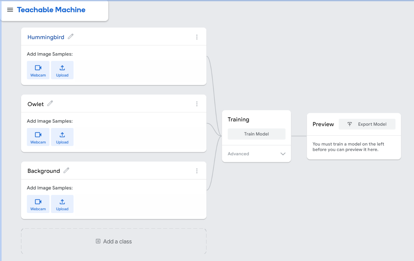 Go to your Teachable Machine tab and create three different classes in your image recognition model. To add a third class, click the “Add a class” button. Name one Hummingbird, one Owlet, and the other Background.