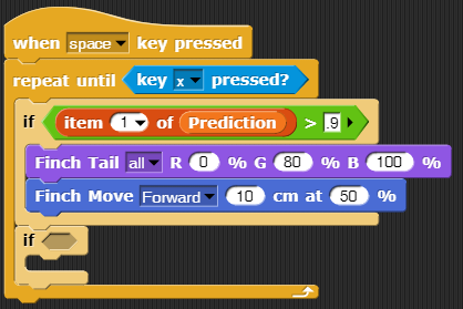 7. Now that you know the probabilities that correspond with each class, you can use that information to control the Finch’s actions. You can use the probabilities to make the Finch perform certain actions when each class is detected.