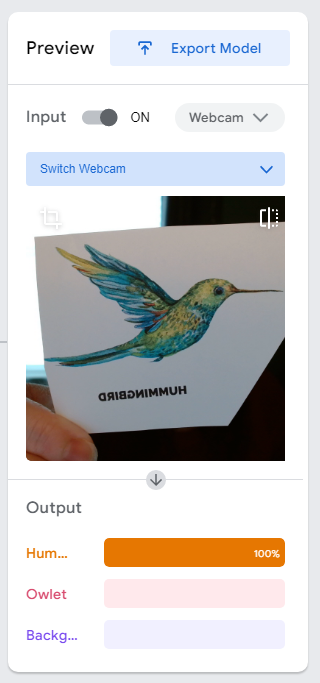 Hold up your Hummingbird to the camera. If the Hummingbird class has the highest percentage, that means that your model recognizes when you are holding up the Hummingbird. Check that the prediction is correct for your Owlet, and your background.