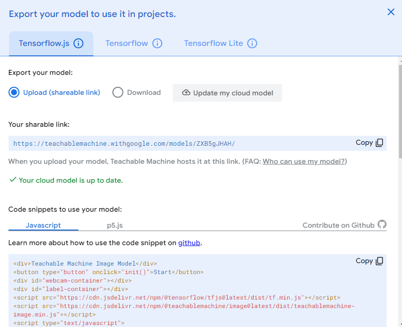 10. After your model has uploaded, you will see a sharable link highlighted in blue. You will need this link in the following steps to create a Snap! project with your model and complete this activity. Copy the sharable link. After you copy the link, you can close the export window. (You can always open the window and access the link again later.)