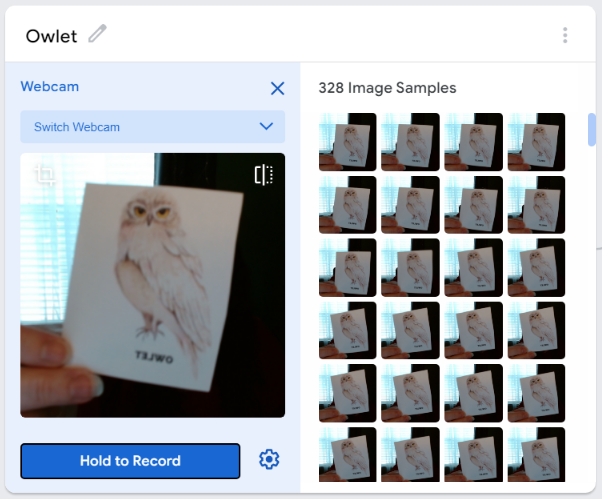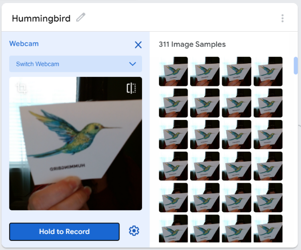 Grab your Hummingbird and click on the Hummingbird class. Use the webcam to take image samples. To do this, click Webcam, center your bird within the frame, and click and hold down the Hold to Record button. As you do this, the image samples will appear to the right. Try to move the bird around slightly so the camera gets a variety of angles.