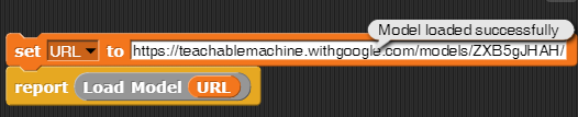 Watch the screen. If the model loaded correctly, you will see a message flash that reads “Model loaded successfully”. The URL will also update in the Snap! stage on the right. If you do not see this message, check that you pasted the URL correctly and try clicking the stack again.