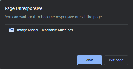 Training the model will take a few minutes. It may take longer depending on your device and internet speed. The tab must stay open and visible while the model is training. Your browser may pop up a warning that the window is unresponsive – ignore this by clicking “Wait” and allow the machine to keep working.