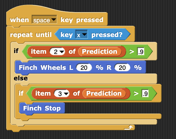 Now that you know the probabilities that correspond with each class, you can use that information to control the Finch’s actions. You can use the probabilities to make the Finch perform certain actions when each class is detected.