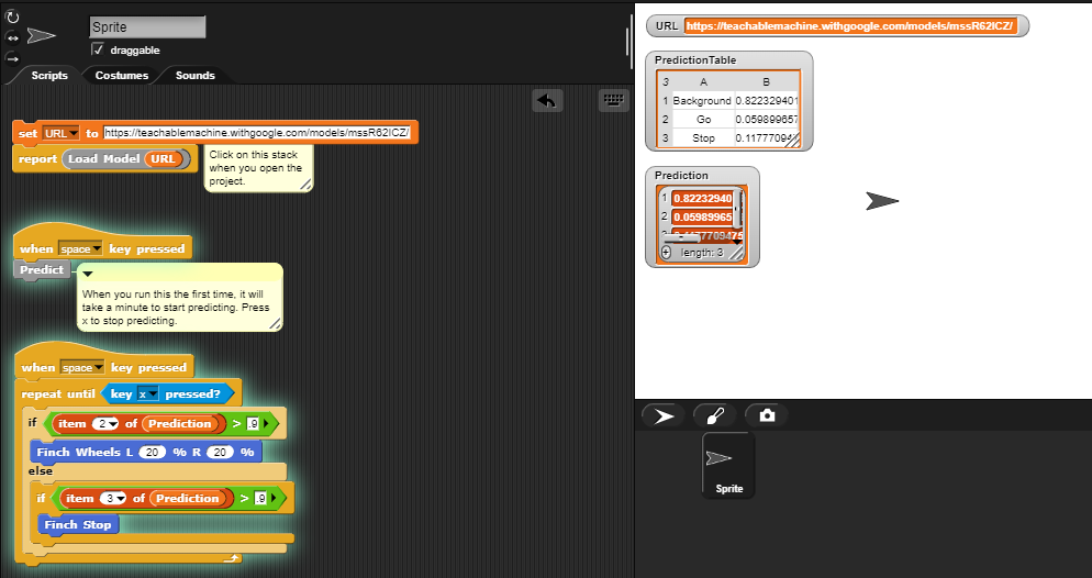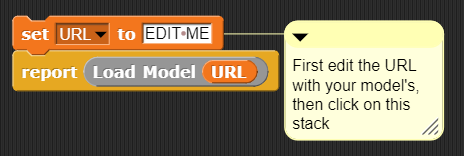 Watch the screen. If the model loaded correctly, you will see a message flash that reads “Model loaded successfully”. The URL will also update in the Snap! stage on the right. If you do not see this message, check that you pasted the URL correctly and try clicking the stack again.