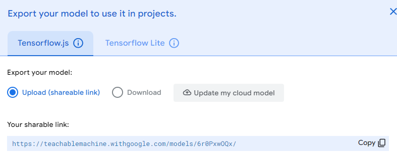 After your model has uploaded, you will see a sharable link highlighted in blue. You will need this link in the following steps to create a Snap! project with your model and complete this activity. Copy the shareable link. After you copy the link, you can close the export window. (You can always open the window and access the link again later.)
