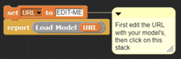 Watch the screen. If the model loaded correctly, you will see a message flash that reads “Model loaded successfully”. The URL will also update in the Snap! stage on the right. If you do not see this message, check that you pasted the URL correctly and try clicking the stack again.