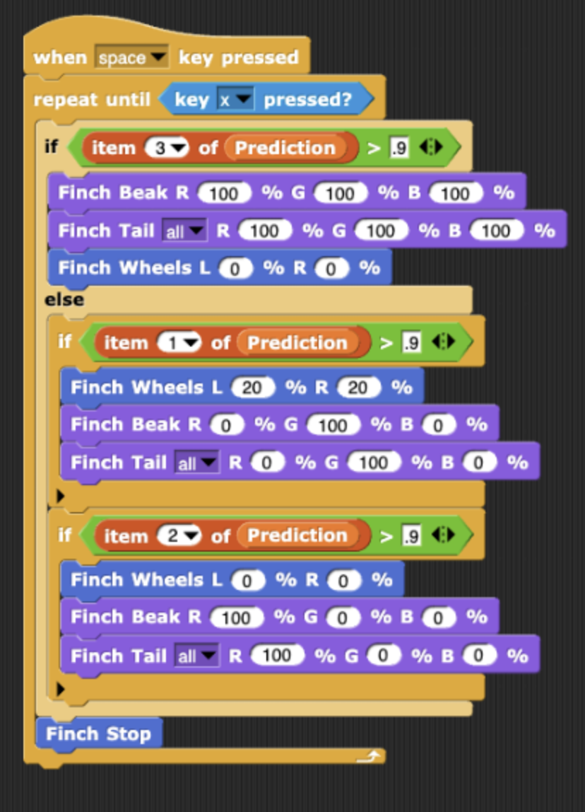 Now that you know the probabilities that correspond with each class, you can use that information to control the Finch’s actions. You can use the probabilities to make the Finch perform certain actions when each class is detected.
