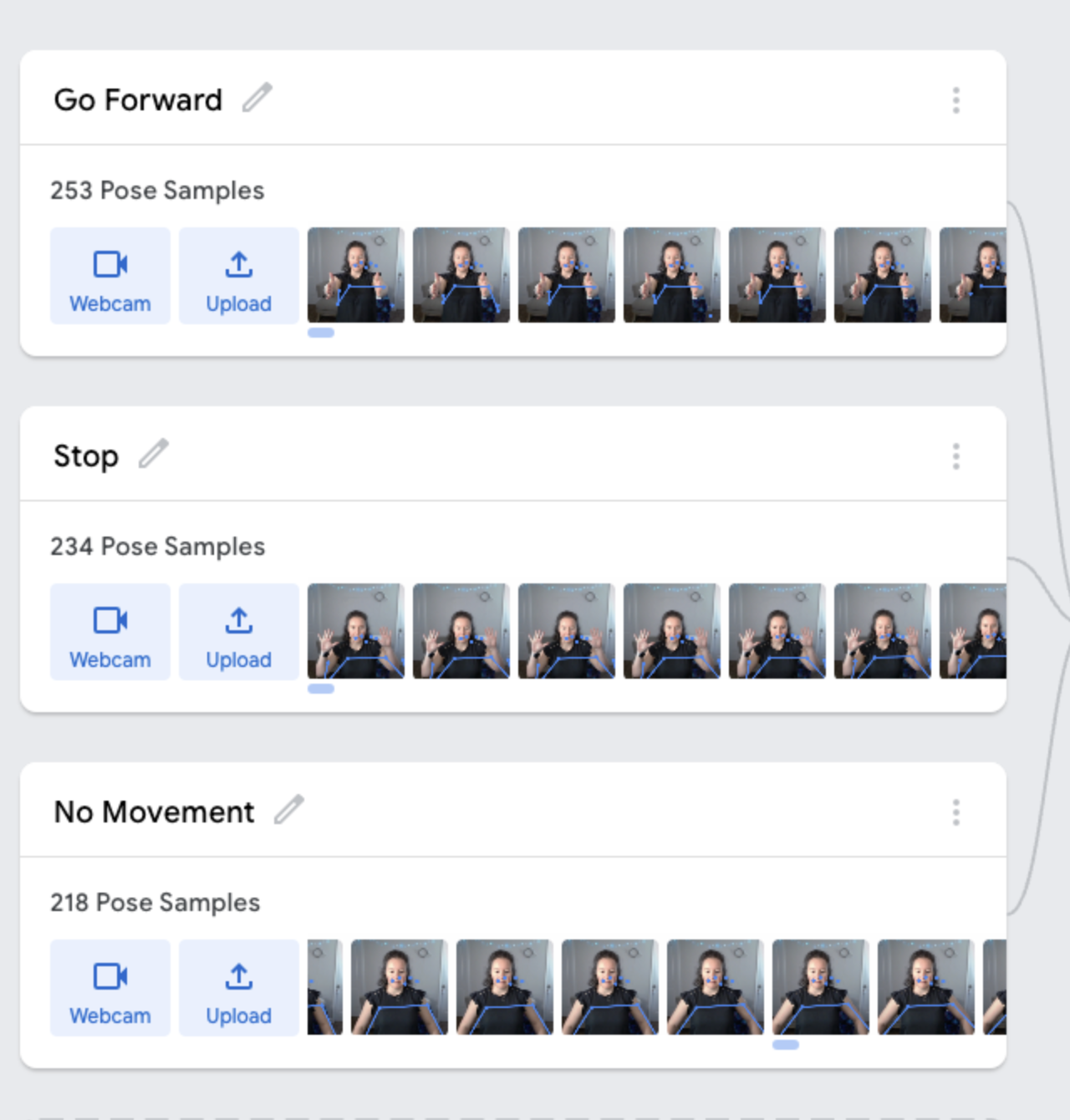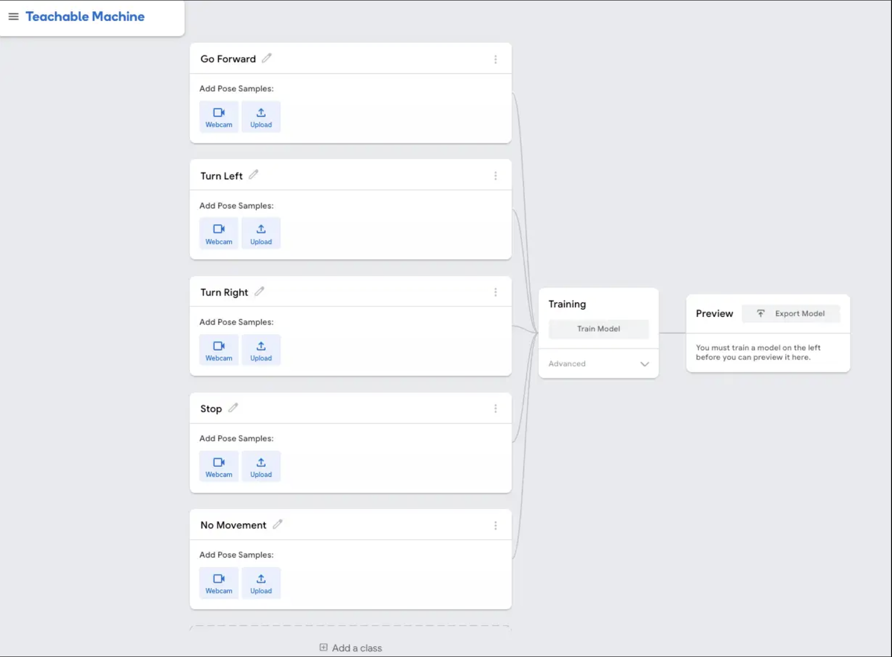 This is very similar to the process that you followed to create your Image and Audio Recognition models. For this Pose Recognition model, you will need to create and name three different classes: Go forward, Stop, and No Movement.