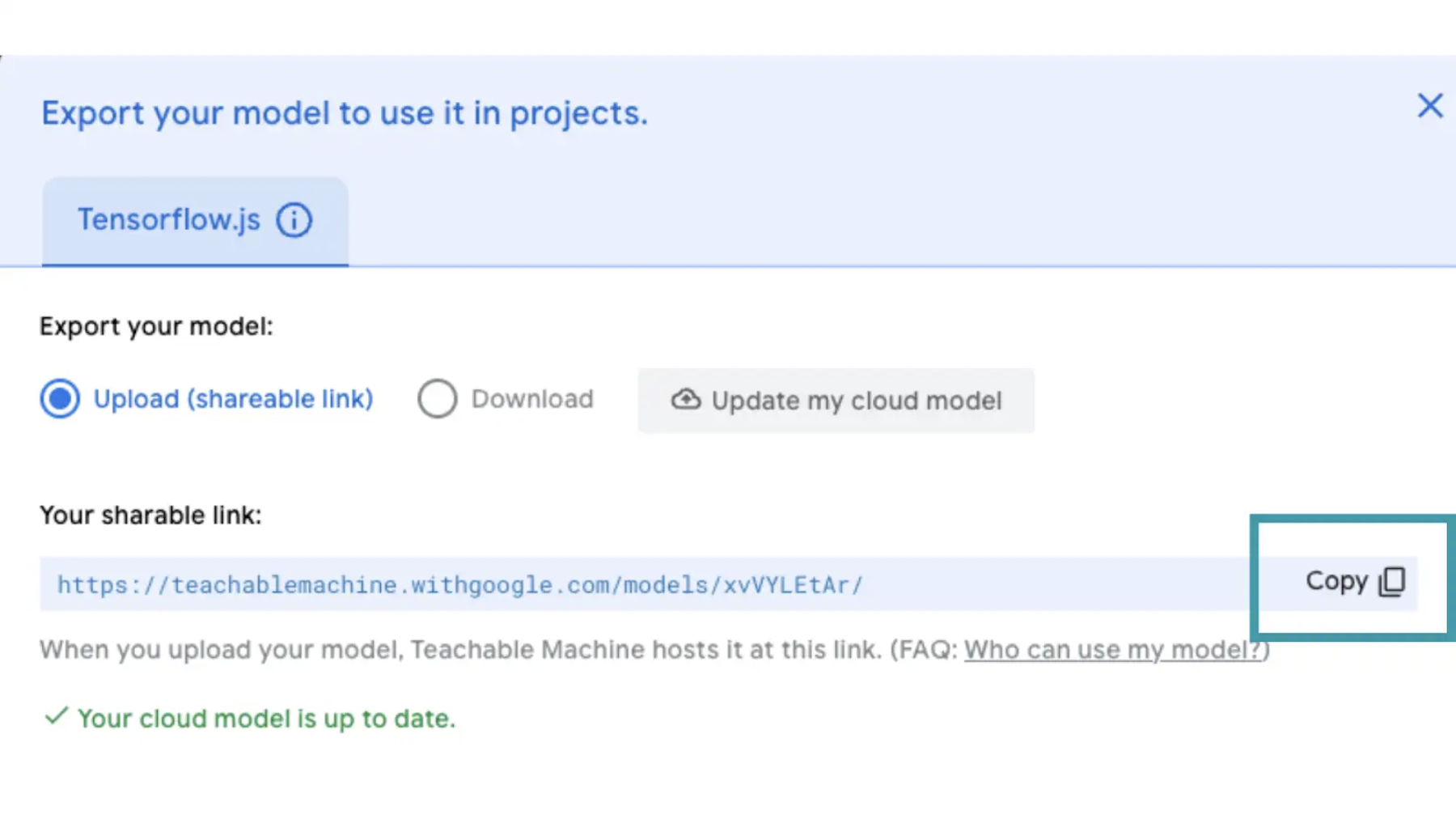 After your model has uploaded, you will see a sharable link highlighted in blue. You will need this link in the following steps to create a Snap! project with your model and complete this activity. Copy the shareable link. After you copy the link, you can close the export window. (You can always open the window and access the link again later.)