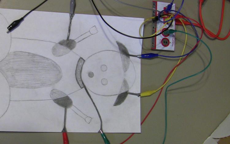 Our setup: a MaKey MaKey connected to a pencil drawing of our friendly dog robot. The MaKey MaKey has five alligator clips connecting to the drawing. We’ve made dark hot spots that have enough pencil lead to be conductive on the drawing’s arms, ears, and collar. The connections are as follows: