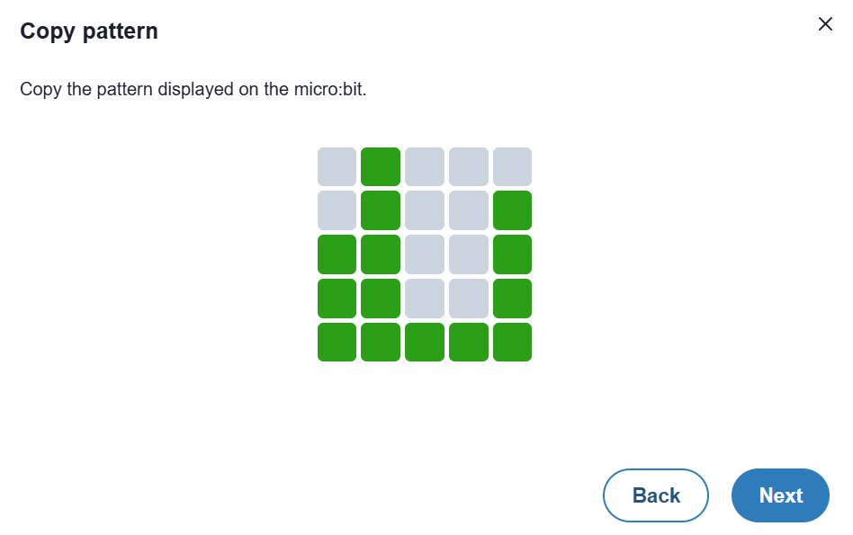 5. Your micro:bit should match the pattern shown on the screen. If it does not, select the cells to match the icon you see on your micro:bit’s 5×5 LED Display. Follow the on-screen instructions to connect via bluetooth.