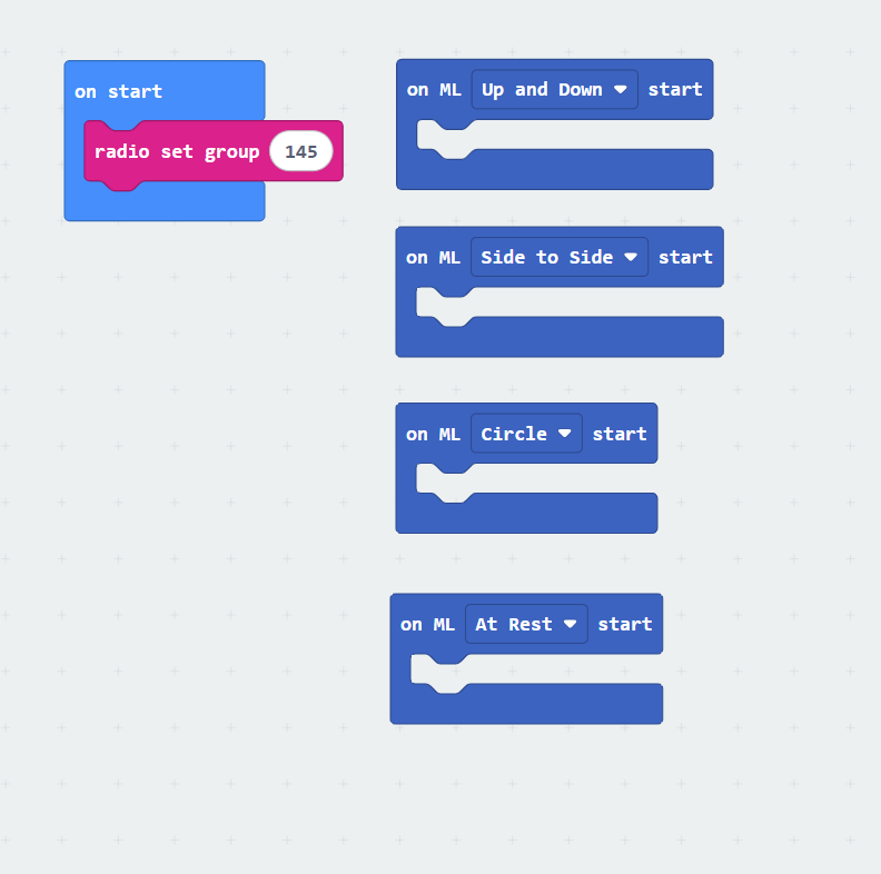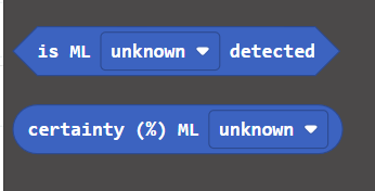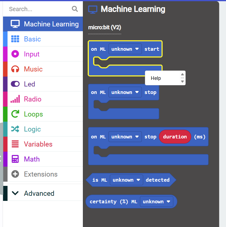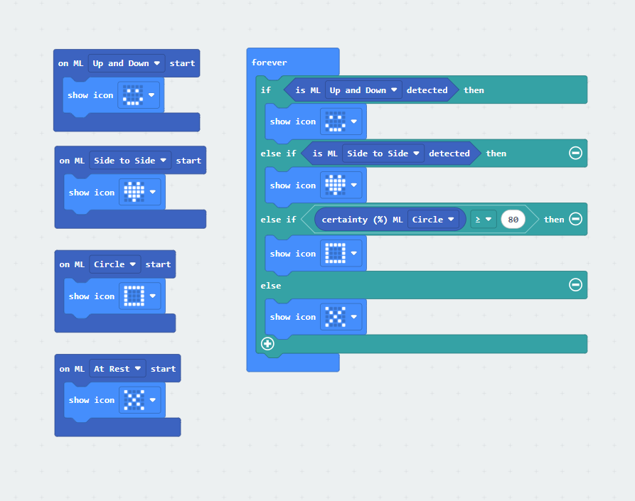 The code on the right shows examples of different ways you can program this model. On the left, you have the on ML start event buttons. On the right, you have if-else statements that can program your model to be more precise, if needed.