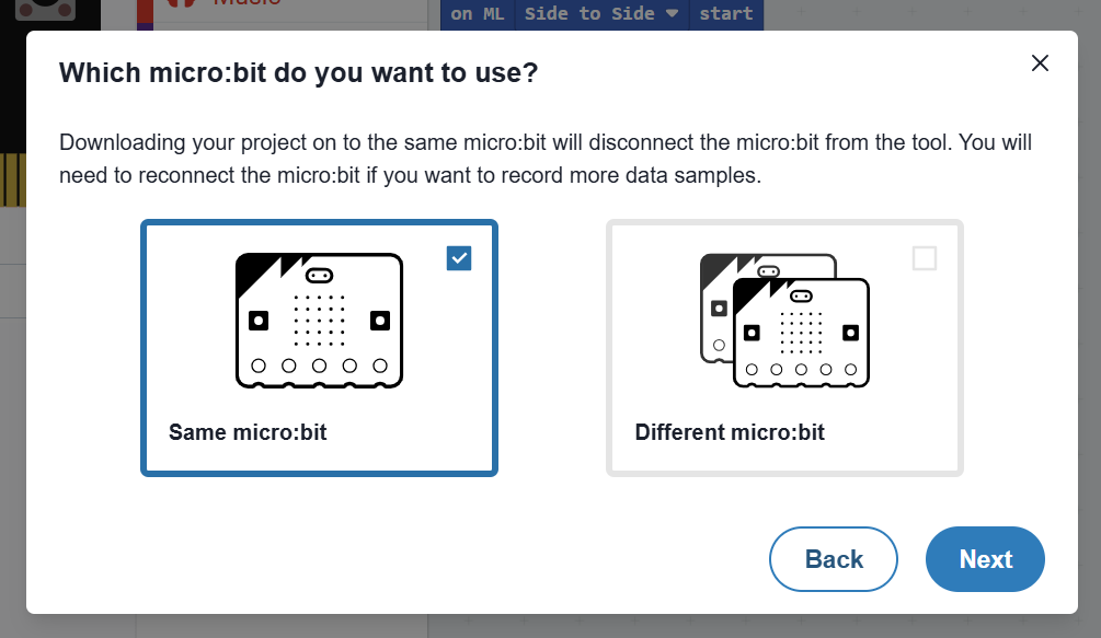 MakeCode will ask you if you want to use the same or a different micro:bit. Select Same micro:bit.