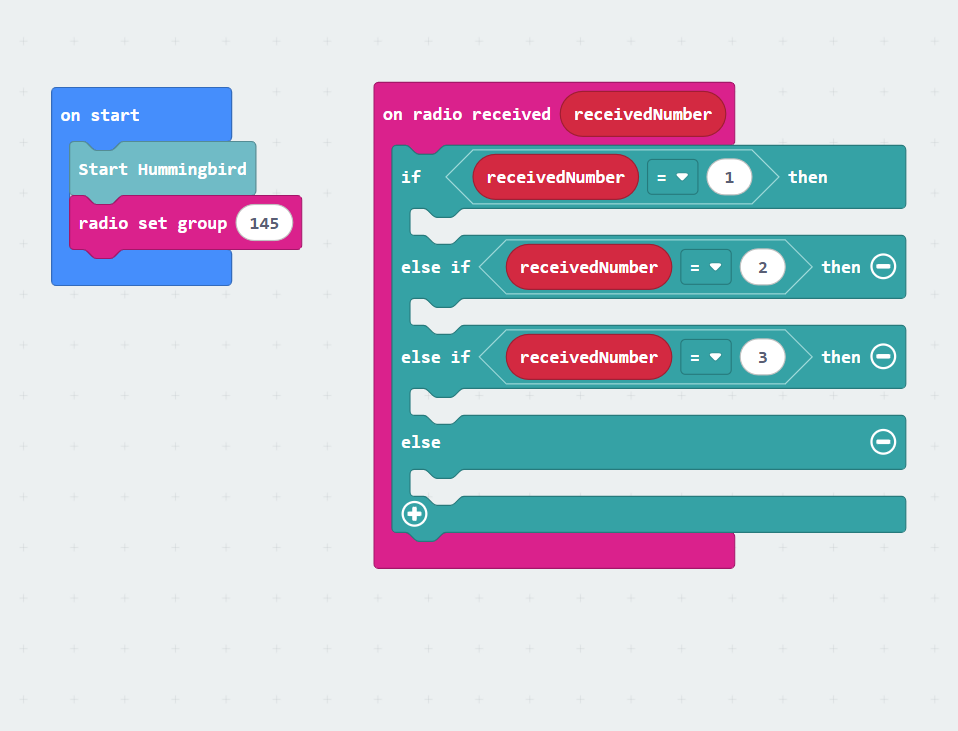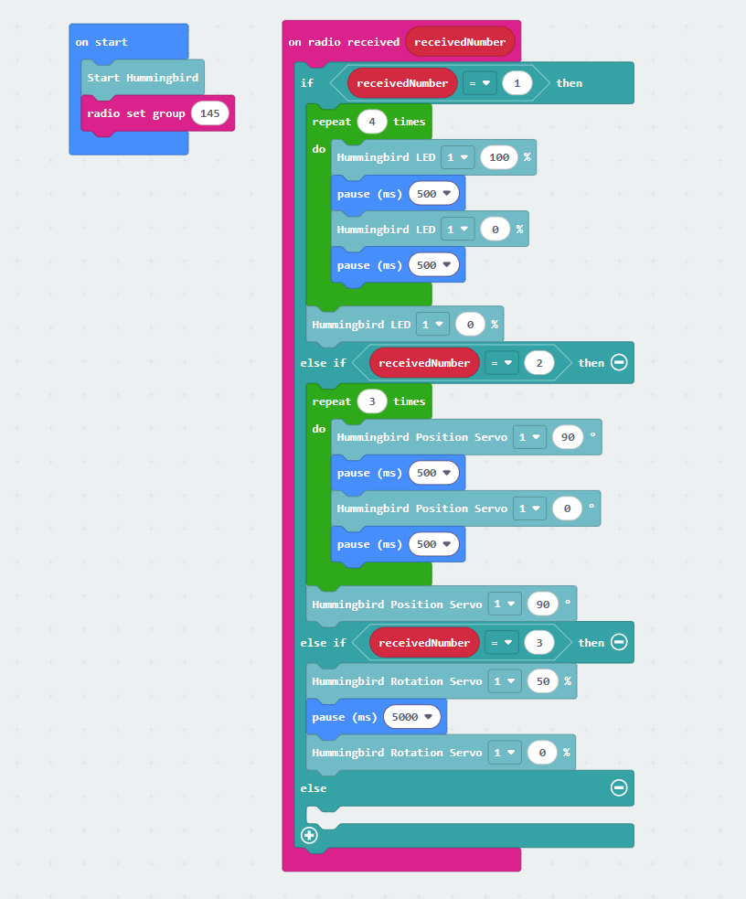 Now that your radio sender and receiver codes are built, let’s add some commands for the Hummingbird! The code on the right will make your starter project do the following tasks based on the magic wand gestures: