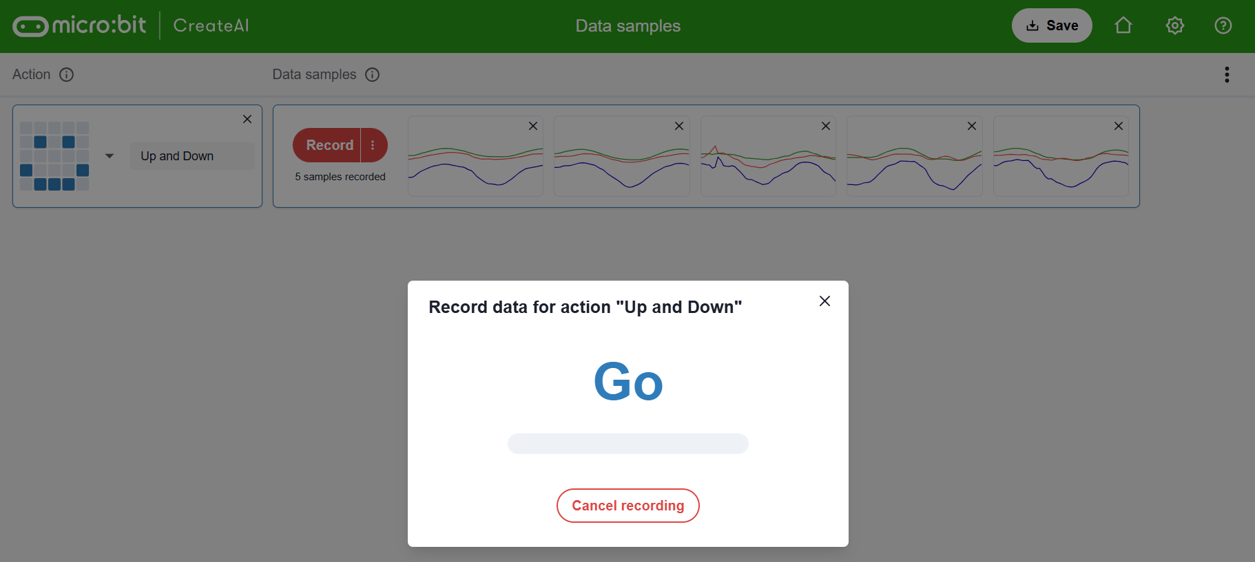 While you are continuously moving your wand up and down, select the red “Record” button to record your data sample.