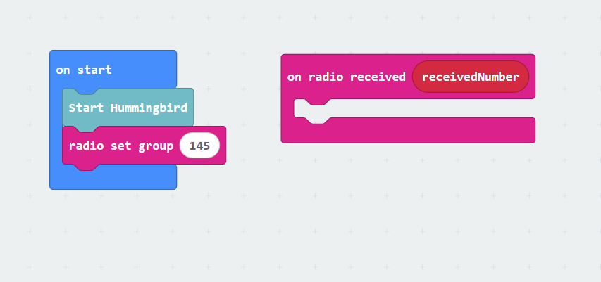 Drag out an “on start” block from the blue BASIC category. Then drag a “radio set group” block from the pink RADIO category and place that in the “on start” block. Click the number in the radio set group block to set the radio group number. You can use a number between 1 and 255. Remember this number!