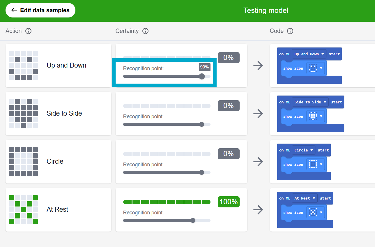 ML also works well in education because it can be simplified to work with small sets of data. This makes it ideal for classroom use with the micro:bit, allowing students to experience how ML works for themselves using personal movement data they gather from the micro:bit’s accelerometer sensor.