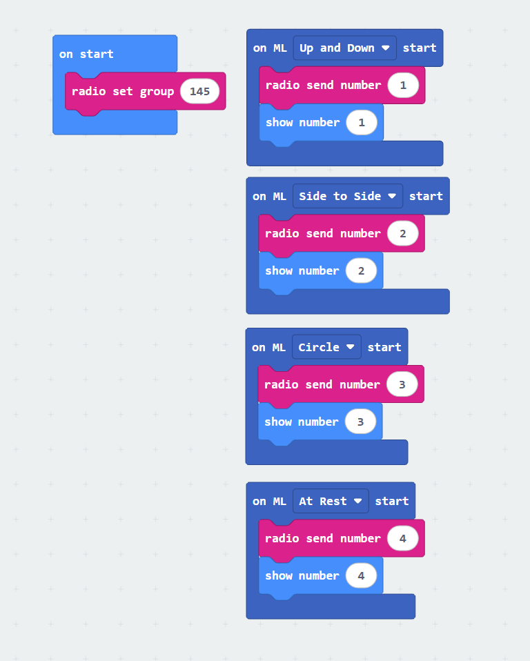 3. Drag a “radio send number” block from the pink RADIO category and place one block into each of the “on ML start” event blocks. Next, drag a “show number” block from the blue BASIC category beneath each “radio send number” block.