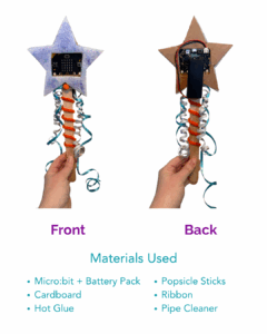 Your magic wand can be designed any way you want! Get creative and make something magical! Be sure your micro:bit and battery pack are securely attached to your wand in some way. Here is an example build.