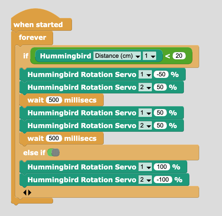 To create a basic program to move and avoid obstacles, use the distance sensor to detect when the rover is near a wall or another obstacle. If the rover detects an obstacle, it should back up and turn. Otherwise, the rover should drive forward. Basic code for this is shown here. Note that two rotation servos on the rover point in opposite directions. This means that to move the rover forward, the two servos must move in opposite directions.