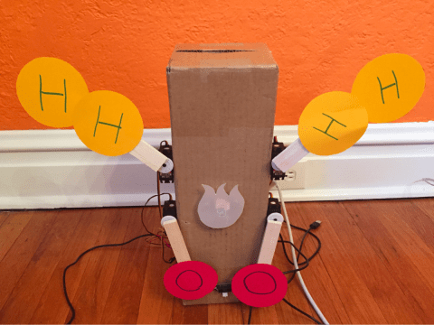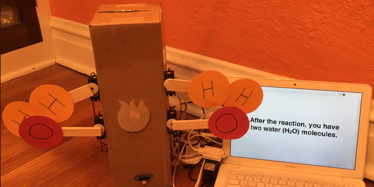 This project demonstrates how the Hummingbird can be used to create a robotic diorama to illustrate a scientific process, the chemical reaction of hydrogen and oxygen to form water. Projects such as this can enable students to demonstrate their understanding of a science concept while also practicing skills in engineering and computer science.