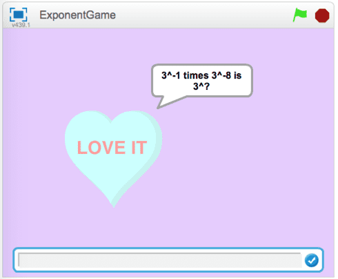Snap! does not contain an operator that will compute the answer to this question. To check the user’s answer, students must add the exponents together (technically, they could also use recursion, but we will not consider that approach here). Implementing this in the game reinforces the rules for working with exponents.
