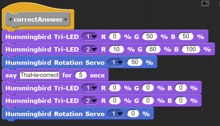 After computing the correct answer, the program uses both the screen and the Hummingbird robot to tell the user whether their answer was correct or incorrect. The robot includes two tri-color LEDs and one rotation servo. When the user is correct, a custom block makes the two LEDs teal and purple, while the rotation servo uses a small linkage to move a purple heart. When the user is incorrect, another custom block turns the lights red and vibrates two red pom-poms. This custom block includes a parameter that tells the user the correct answer to the problem.
