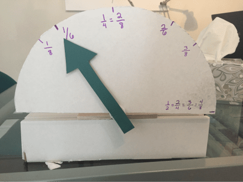 In this project, the servo motor is mounted behind a semicircle that has a variety of fractions labelled on it. The program moves the servo motor to point at different fractions while speak or say blocks are used to explain how different unit fractions add up to a fraction that is equivalent to one half. For example, the program states that 3/6 is the same as 1/2. Then it points to 1/6, then 2/6, then 3/6.