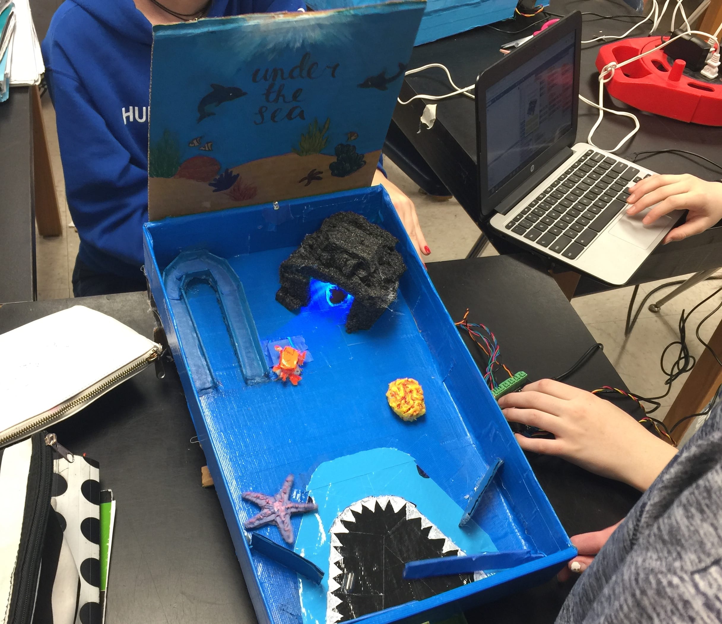Next, students are challenged to build a pinball machine with the Hummingbird. The game must have a clear, engaging theme and incorporate at least 3 simple or compound machines to apply Newton’s laws of motion. Students can use the attached planning document to design their machine.