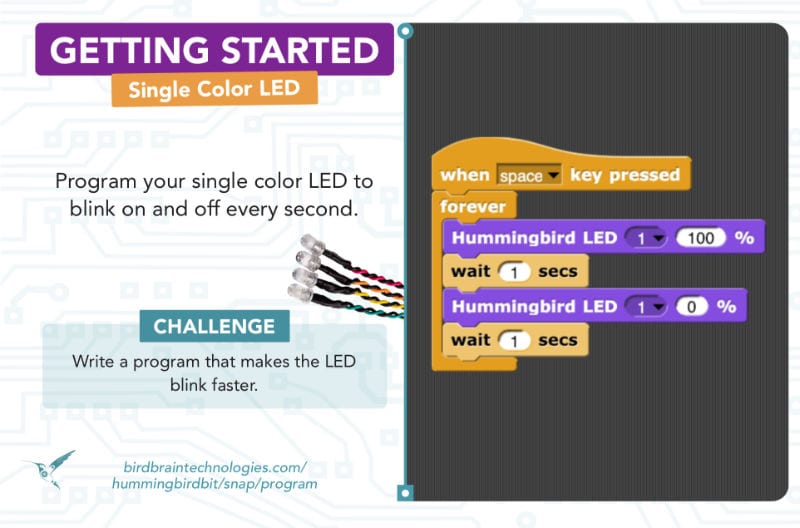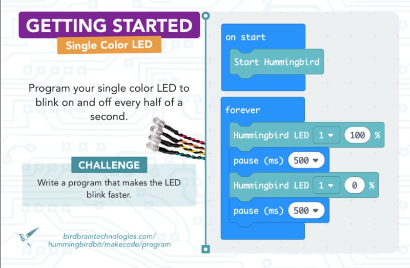 Use these cards to begin coding your Hummingbird Bit Robotics Kit in BirdBlox, MakeCode, and Snap!.