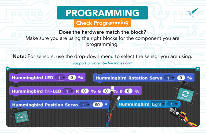 Debugging is part of the creative process! Use these cards to troubleshoot your Hummingbird Bit Robotics Kit in BirdBlox, MakeCode, and Snap!.