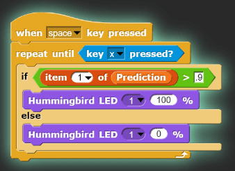 The stage also shows a list variable named Prediction. While the classifier is predicting, you can use the values in this list to control Hummingbird components. Each item in Prediction corresponds to a row in the table. For example, the first item in Prediction is the probability for the first class.