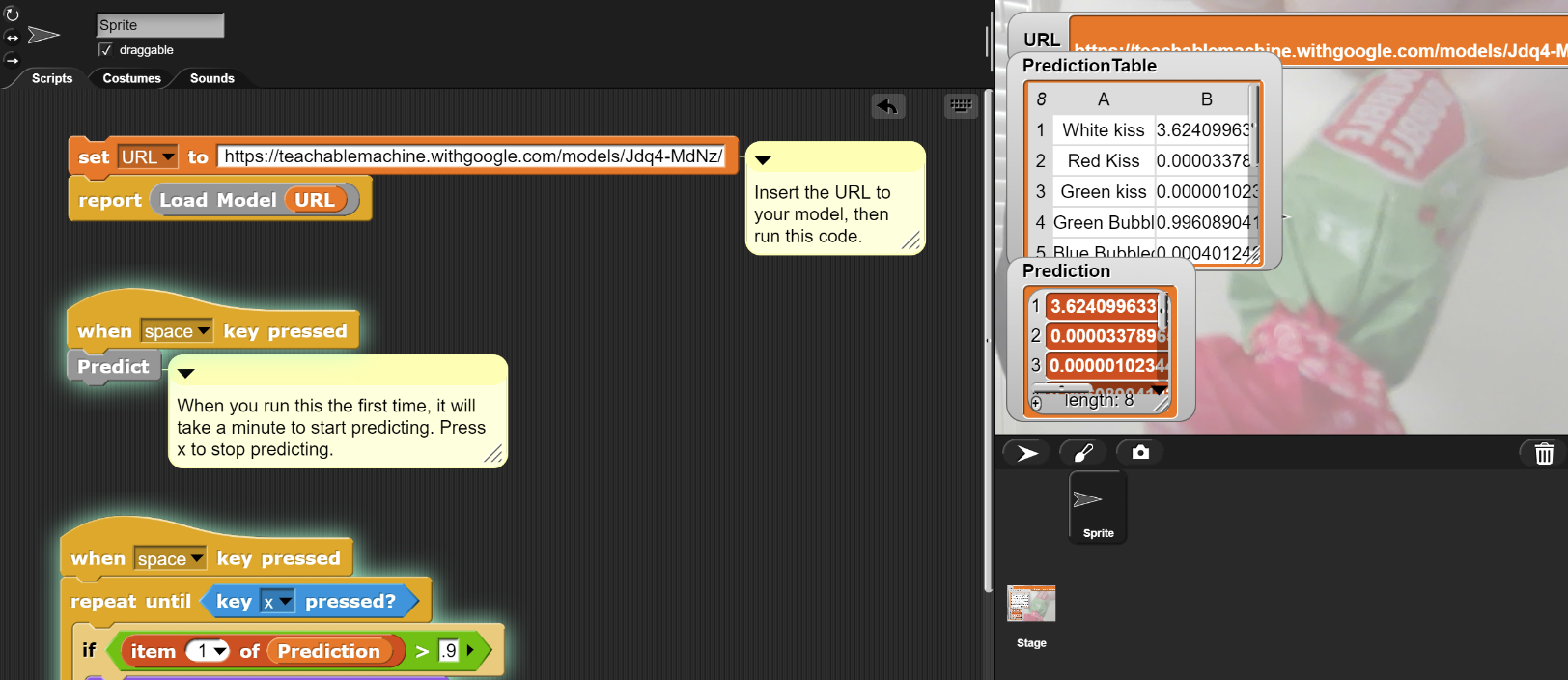 Press the spacebar to see your classifier make predictions in Snap!. It will take up to a minute for the classification to start the first time you run the script. When it starts, the Snap! stage will show you an image of what the webcam sees and a table of prediction information. The table lists each classification class and the probability that the current image on the webcam belongs to that class. A probability close to 1 tells you that the image probably belongs to that class, while a probability close to 0 tells you that the image probably doesn’t belong to that class. For example, in this picture, the probability of “Green Bubblegum” is greater than 0.99, while the probabilities of all other classes are very small. Note sometimes probabilities will seem to show values greater than one; that is only because extremely small values are shown in scientific notation.