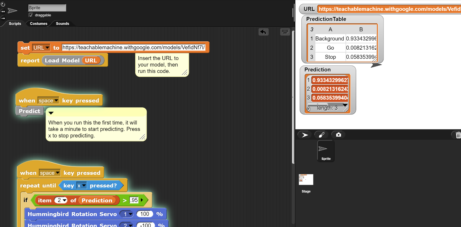 Modify the top script to set the URL variable to the link for your classifier. Then click on this stack of blocks to run the top script. You will only need to run this script once to load the libraries and the model. If the URL was correct and the model loaded correctly, you will see a message that reads “Model loaded successfully”. If this did not happen, check that the URL is correct and try clicking the stack again.