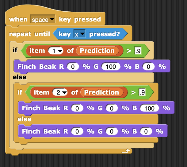 Modify the top script to set the URL variable to the link for your classifier. Then click on this stack of blocks to run the top script. You will only need to run this script once to load the libraries and the model. If the URL was correct and the model loaded correctly, you will see a message that reads “Model loaded successfully”. If this did not happen, check that the URL is correct and try clicking the stack again.