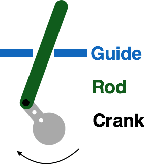 - This diagram shows an idealized version of the crank mechanism. The length of the crank is c, and r is the length of the rod. G is the point where the guide keeps the rod in place. The rod must always pass through this point.