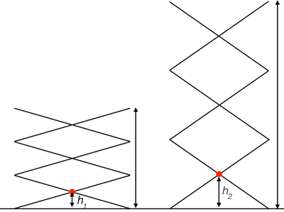 - As the red point on the linkage moves from height h1 to height h2, how far does the top of the linkage move? Defend your answer using congruent triangles.