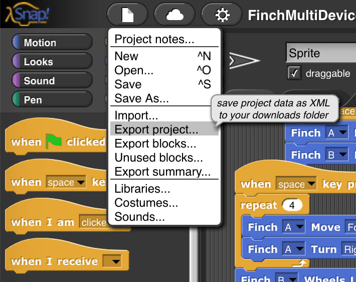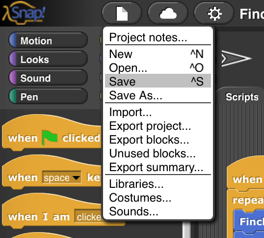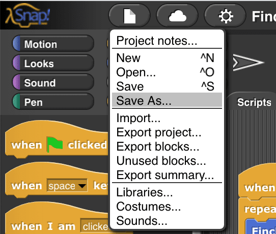 It is important to save your work frequently in Snap!. Snap! does not save automatically. This will cover two different ways of saving your work. First, you can export your work and save it to your computer or a USB drive. If you have internet access, you can also save your work online using a Snap! cloud account.