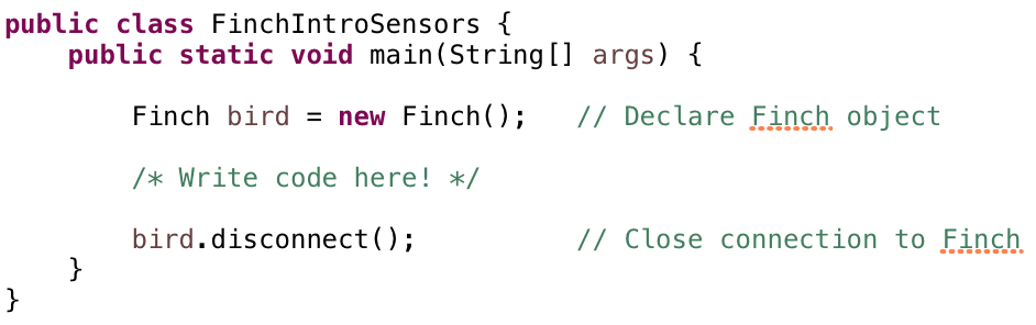 In the last lesson, you learned to make the Finch move and turn. This uses the motors in the wheels, which are Finch outputs. Outputs are ways that the Finch can act on the world or communicate with the user; they include the motors, lights, and buzzer. The Finch also has inputs called sensors. The sensors collect data about the environment around the Finch and provide this data to your program. In this lesson, you will explore some of the kinds of data that you can collect with the Finch sensors.